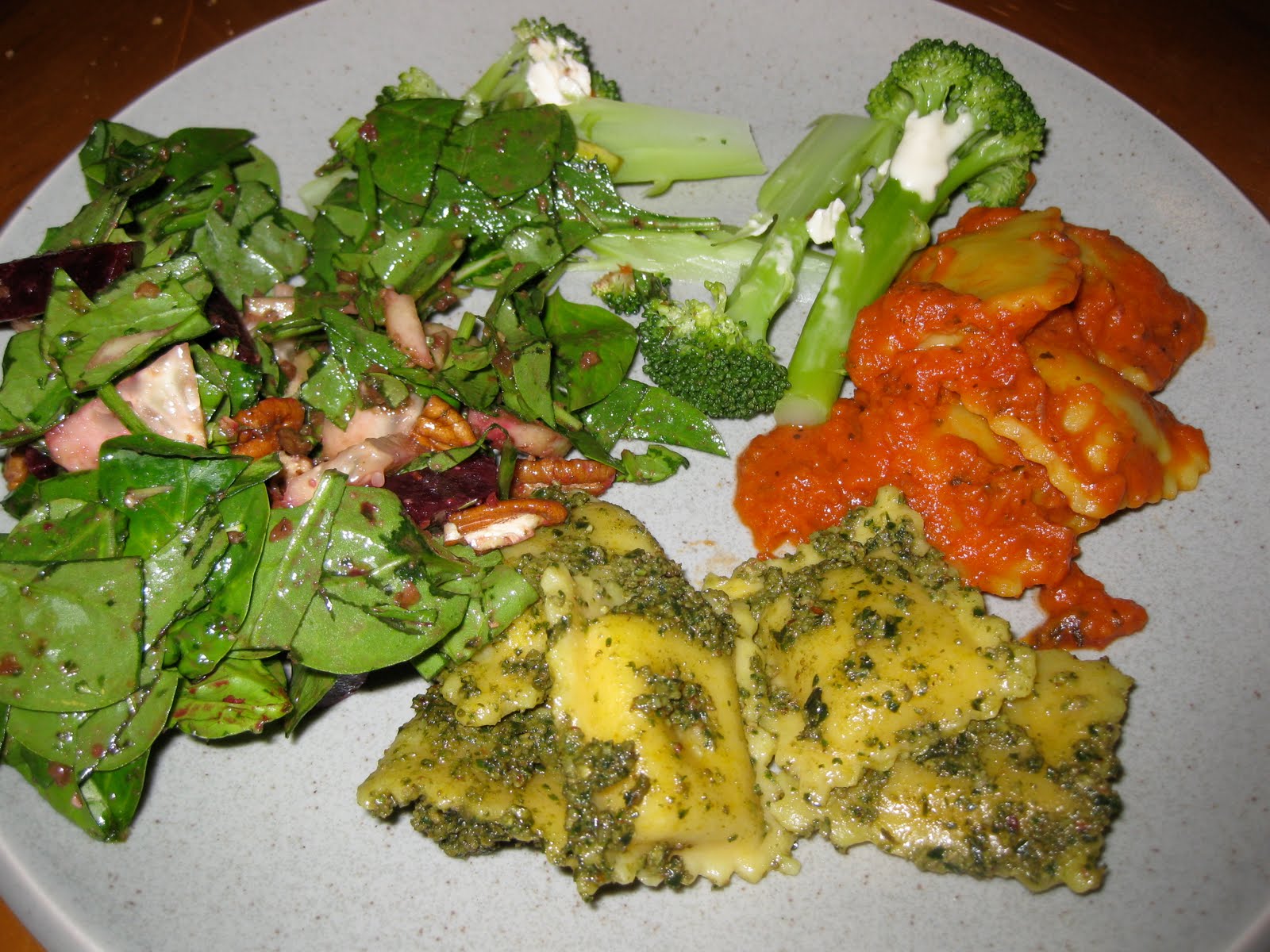 Yummy, Rising Moon has a vegan ravioli with butternut squash in it and my whole family likes it. Its a good thing when everyone eats the same thing, less work for me! Tonight we ate it with red sauce (organic bottled stuff, I added pureed sweet potatoes to it to spice it up a bit) and with homemade pesto. We also dined on steamed broccoli with Earth Balance and a salad with beets, pumpkin seeds, dried cranberries, cucumbers and pecans. I also made a dressing of olive oil, balsamic vinegar, mustard, garlic, strawberry jam and a dash of salt and pepper. A divine meal was had by all. Even my dad who ribbed me mercilessly about my new vegan eating. I know he means no harm though, its just very different from how most people have been taught. I am grateful that I have educated myself and that I know I am doing the best thing for me. Each to their own in this world.